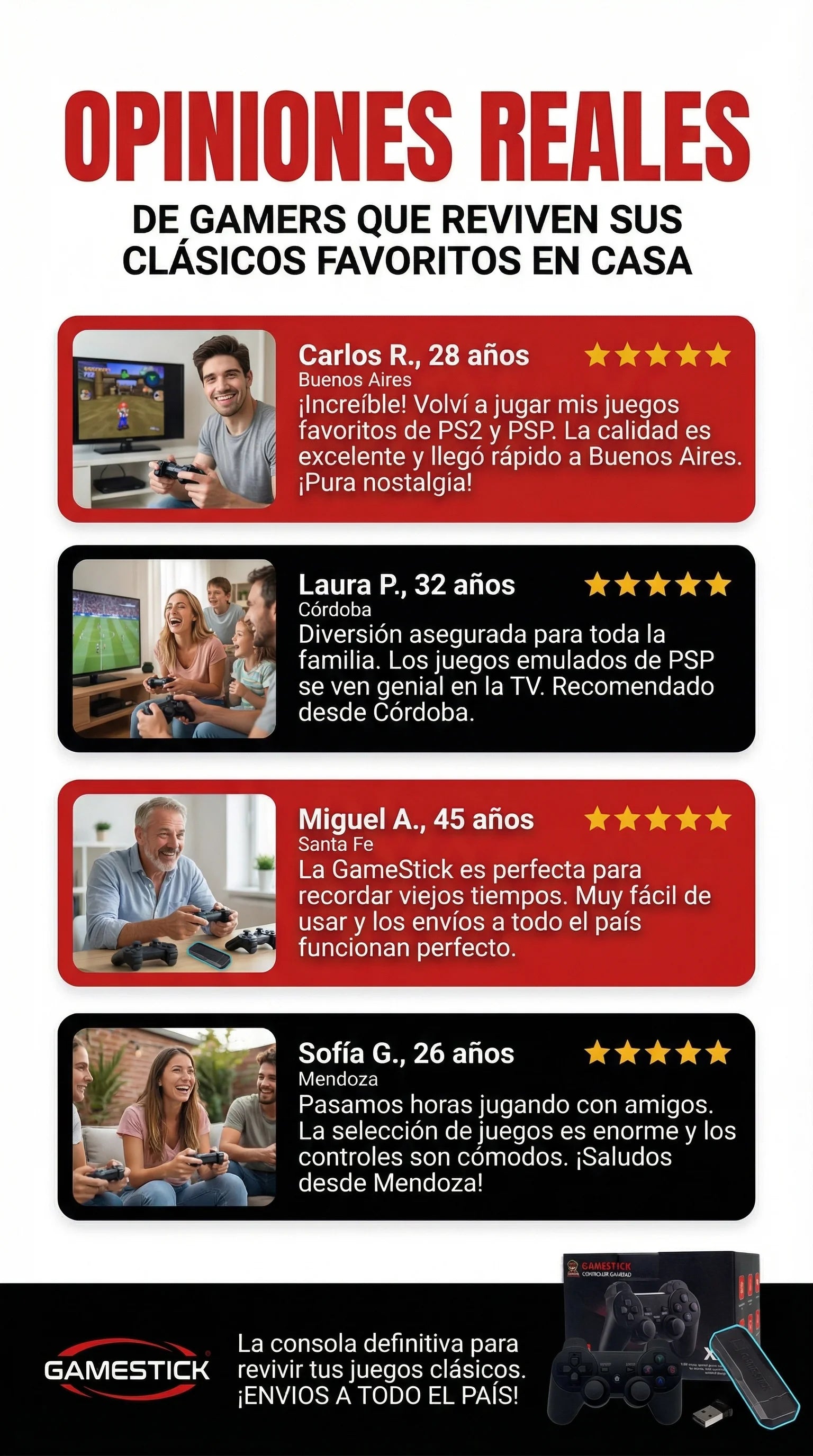María S. 24 de Marz 2023Comprador verificadoCliente de Buenos Aires“Excelente compra. La Game Stick llegó rápido, se instala en un segundo y realmente funciona en cualquier televisor con HDMI. Trae muchos juegos clásicos que me encantaron.”CONSOLA RETRO GAME STICK X2 PLUS (2026) ¿Te fue útil esto? 52 0