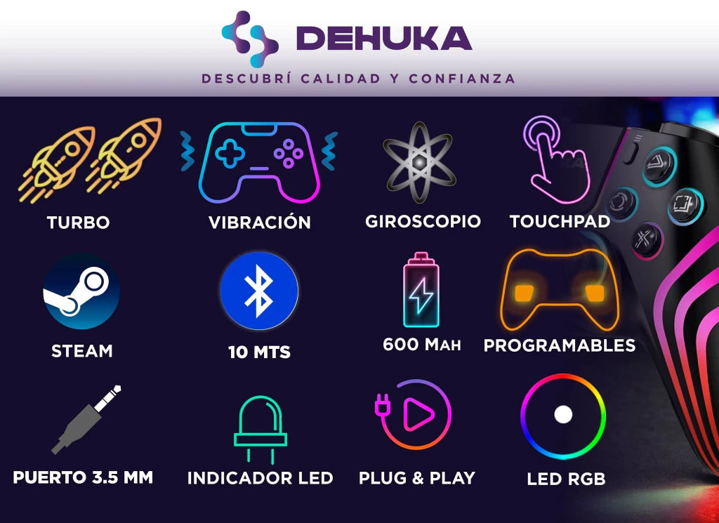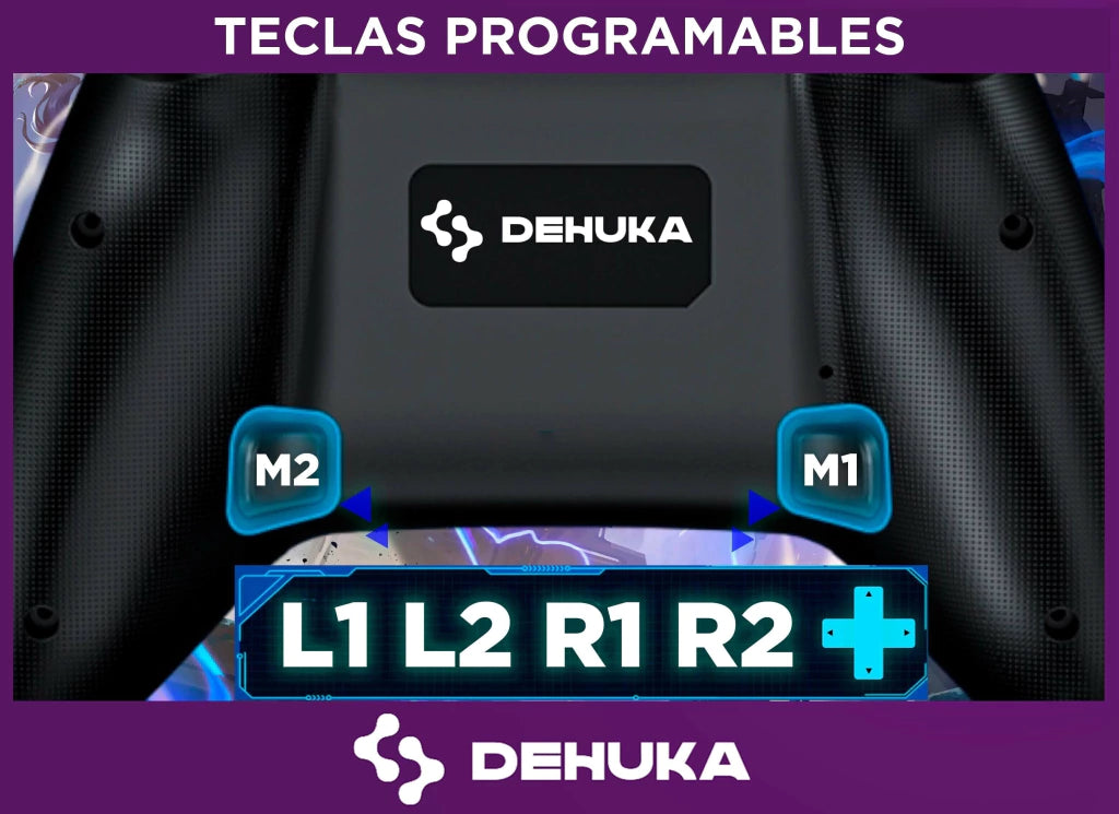 Este mando inalámbrico Dehuka está diseñado para jugadores exigentes que buscan precisión, personalización y estilo. Compatible con P5, P5 Slim y PC, combina tecnología avanzada con un diseño ergonómico para sesiones de juego prolongadas sin fatiga.
