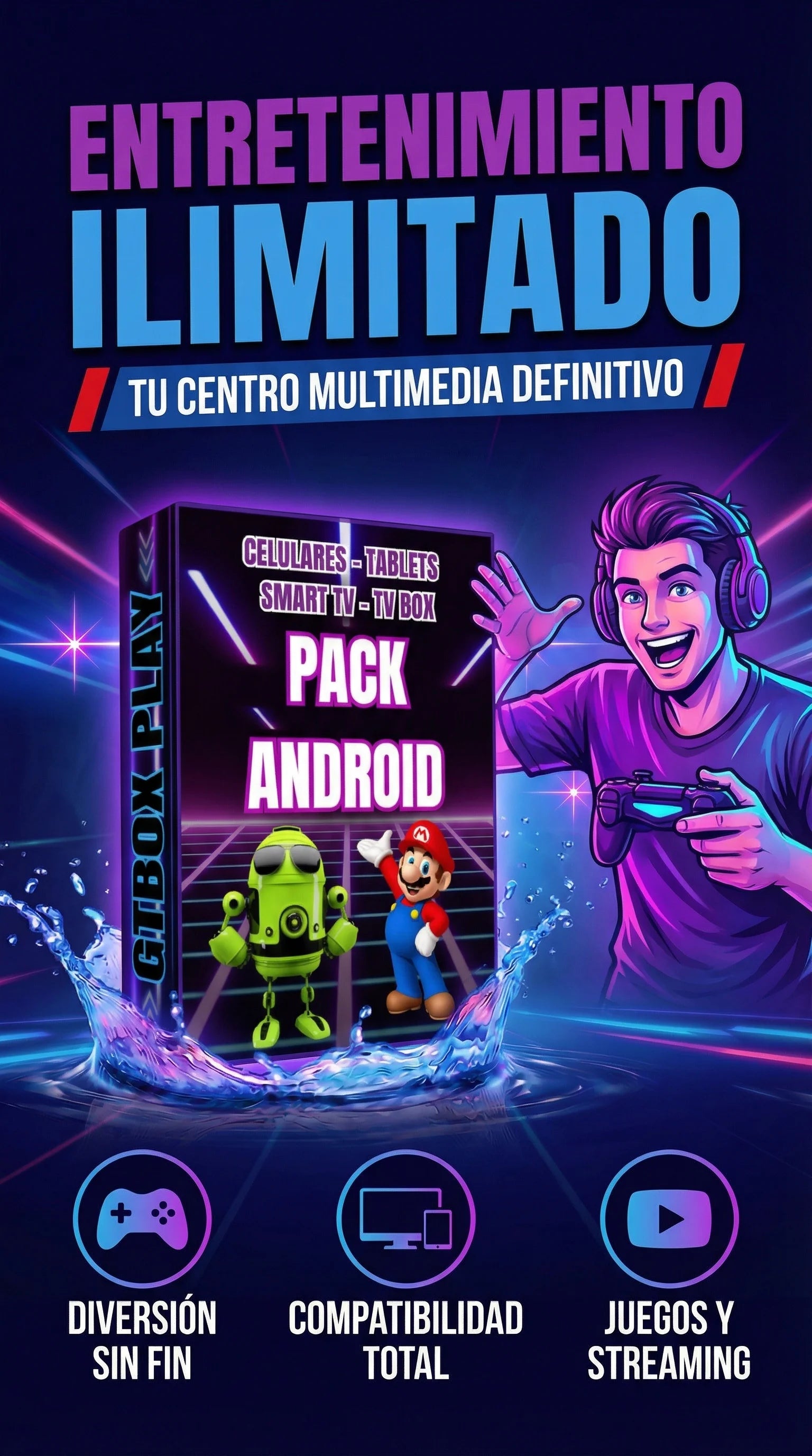 El Pack Android es el pack intermedio de GTBOX PLAY y uno de los más elegidos. Diseñado para quienes quieren muchísimo contenido, grandes consolas y una experiencia fluida, sin ir al extremo del Ultimate.